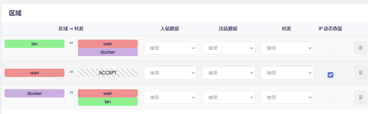 在系统的防火墙设置(luci/admin/network/firewall)中: