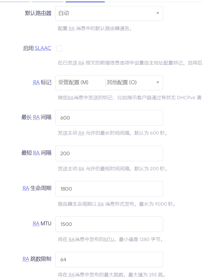 通告的 IPv6 DNS 服务器设为合适的v6公网DNS,此处可使用清华大学TUNA协会的dns:2001:da8::666“IPv6 RA设置”中,请勾选“启用 SLAAC”,其余选项可选择与我保持一致,见下图: